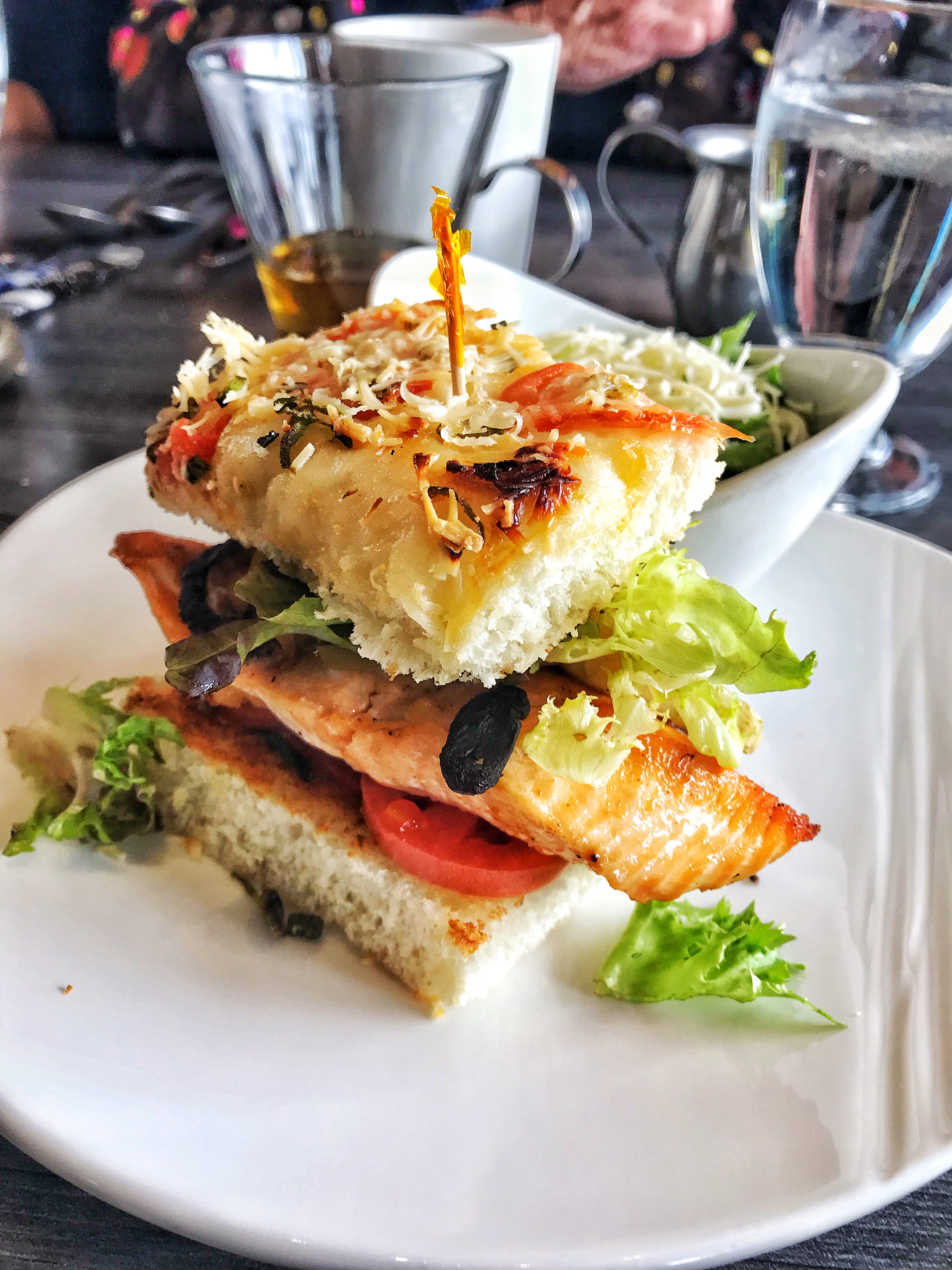 Two of us including me ordered Saumon Panini ($14) – Grilled salmon on focaccia with artichokes, greens and shitake mushrooms.