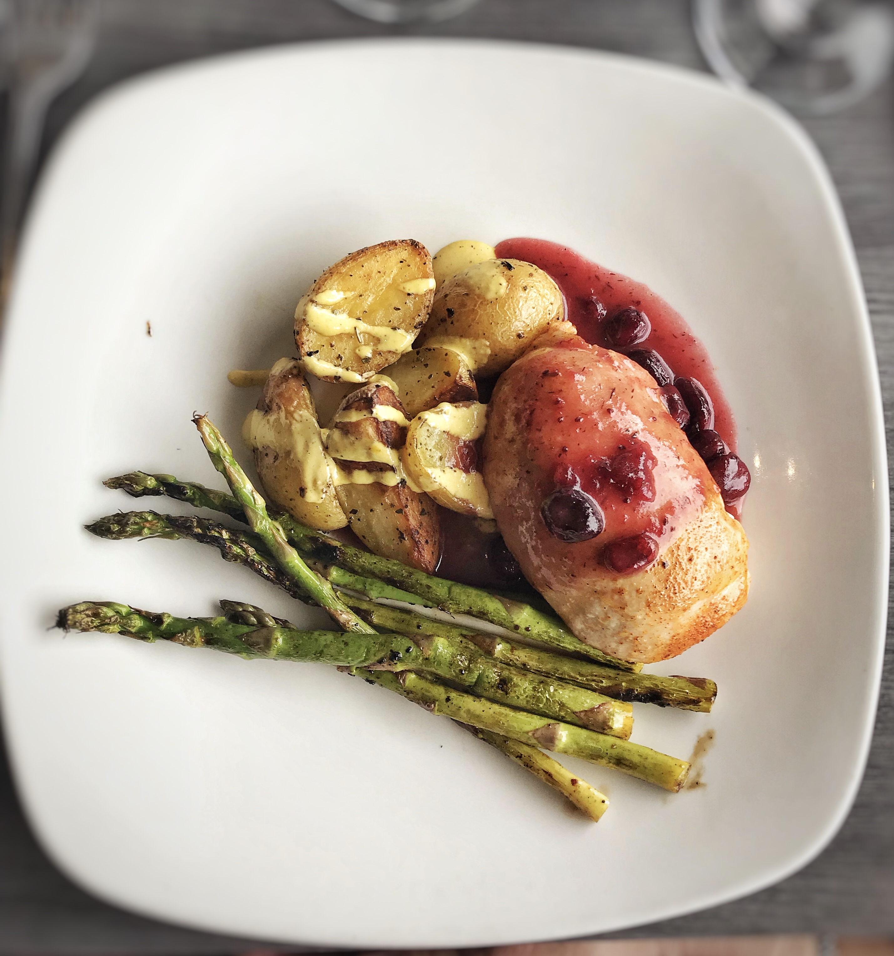Chicken stuffed with apple, havarti & red pepper in a cranberry brown butter gastrique