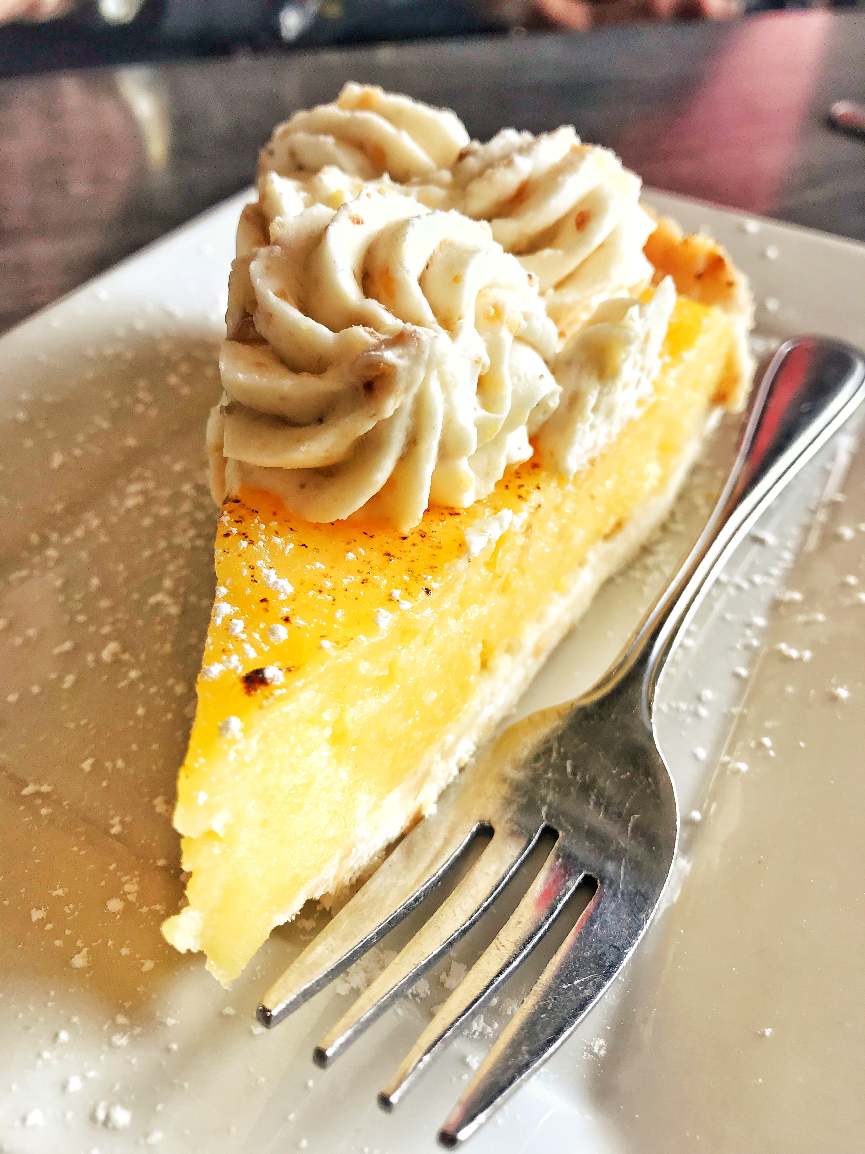 Hazelnut shortbread crust filled with lemon curd topped with a crushed hazelnut whipped cream.