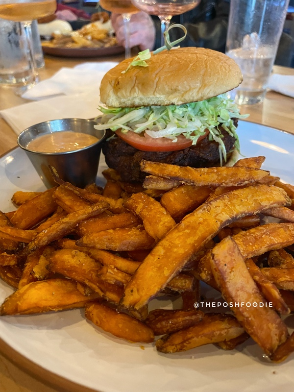 Hand-battered crispy fried chicken is paired with shredded lettuce, tomato, pickles, and creamy ranch dressing. I opted for the “try it buffalo” option to add some kick to it with yam fries.