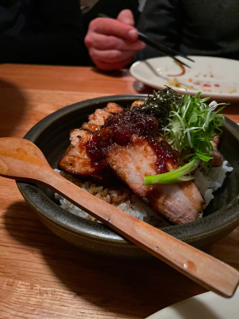 Description: Flanc de porc, riz vapeur, huile gingembre-nanami, daikon oroshi | Pork belly, steamed rice, ginger-nanami oil, daikon oroshi