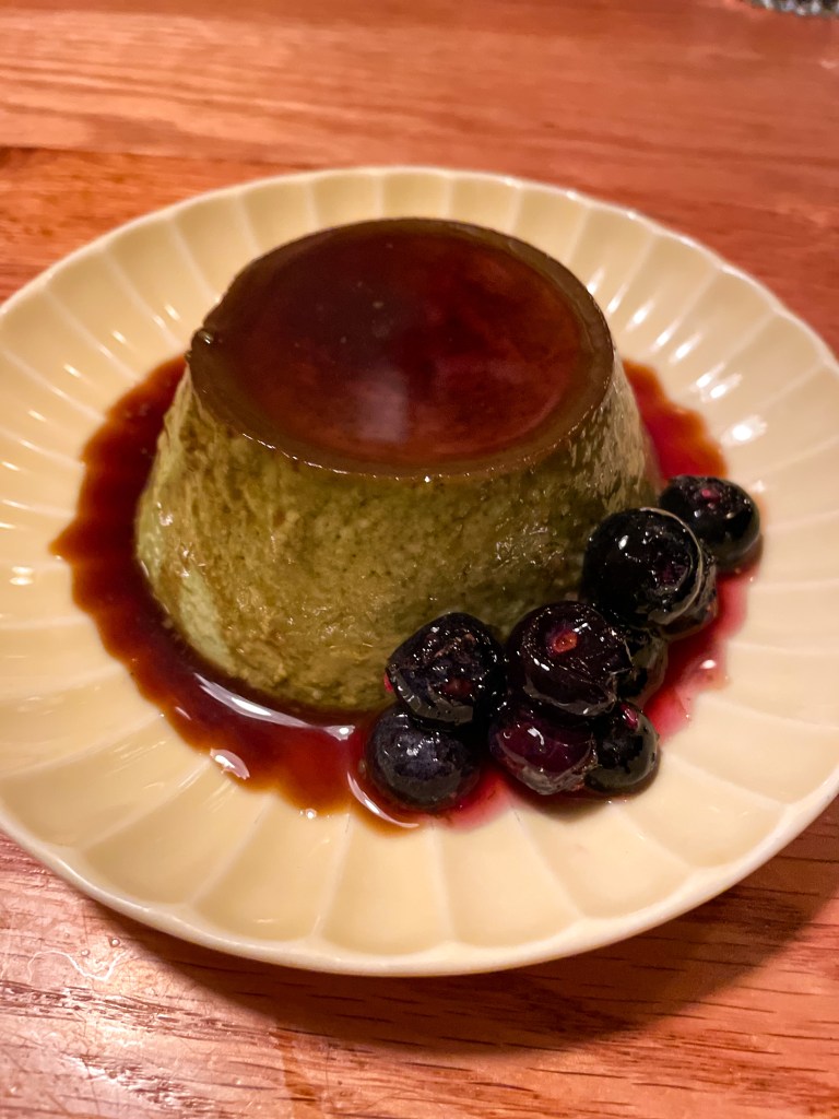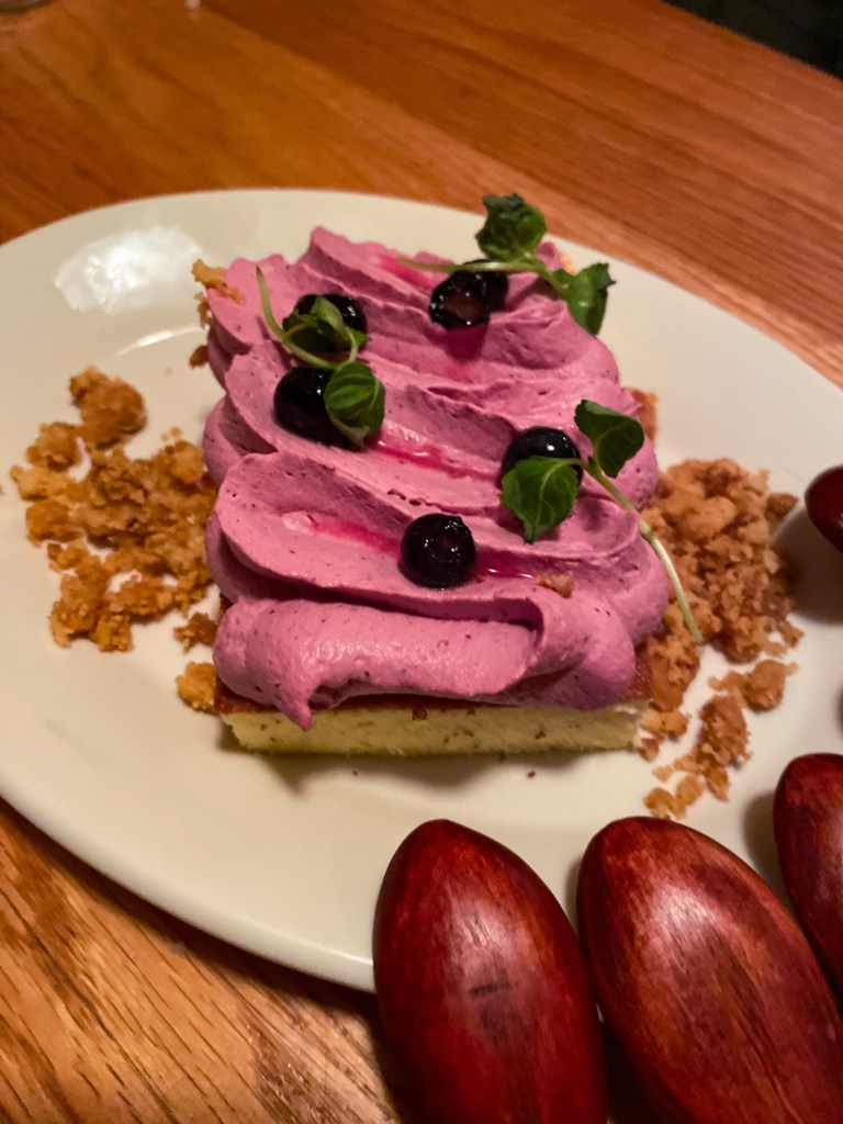 I thought the sponge cake would be sweet but it’s not. Beautiful texture and love the combination with honeyberries. What a great way to finish the meal!