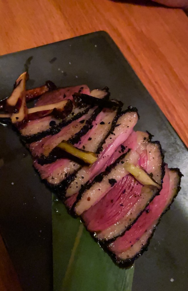 Description: Canard vieilli 3 jours au miso blanc, légèrement carbonisé | 3 days white miso-aged duck, lightly charred