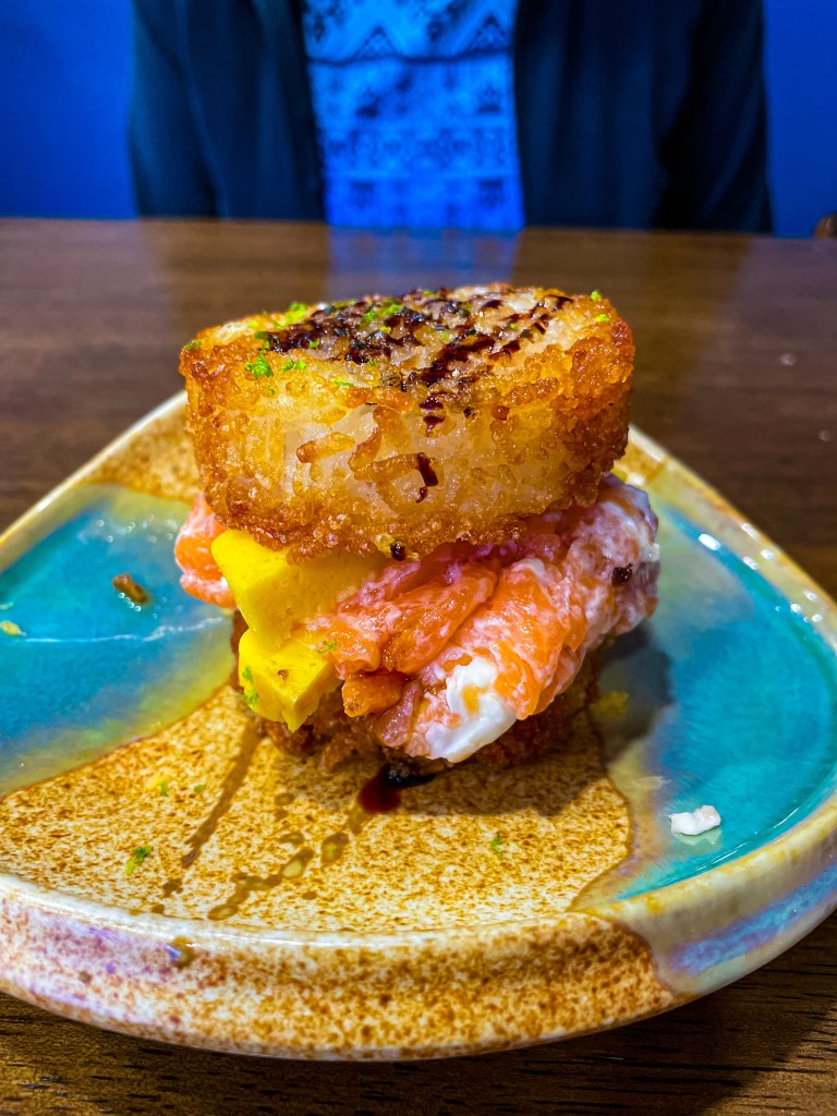 The burger itself was unique and enjoyable, featuring deep-fried rice, creamy salmon masago mix, tamago, lime zest, and unagi sauce. The rice was chewy, and the salmon had a nice flavour.