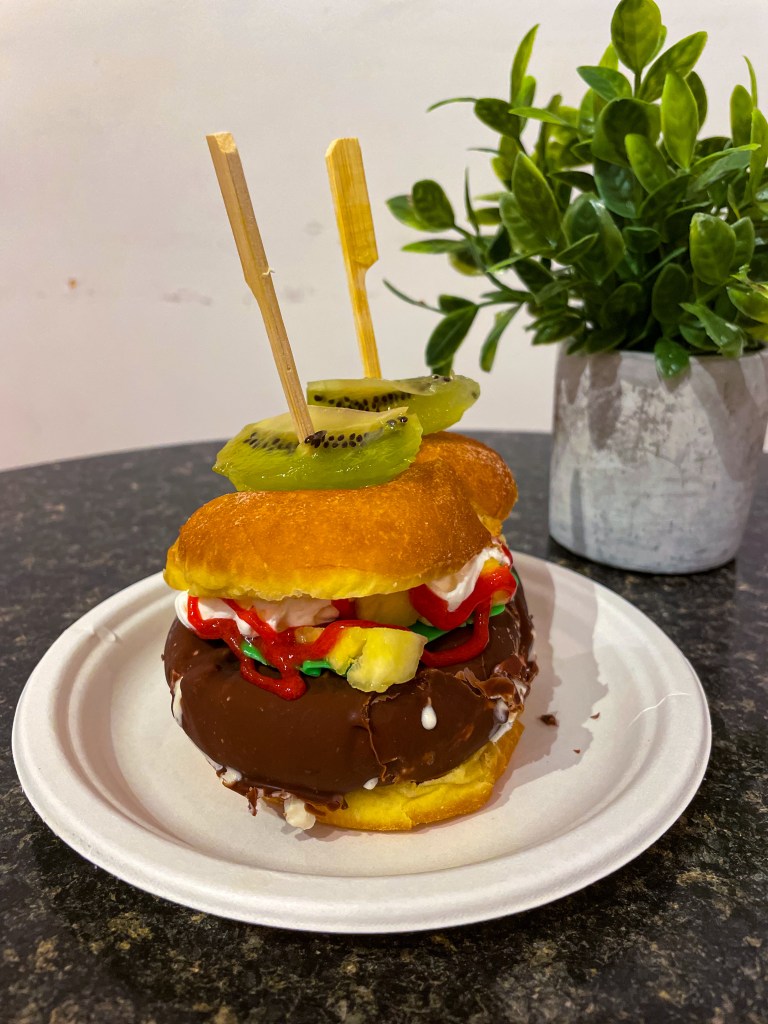 📝All the flavours of a banana split reimagined into the dessert burger of your dreams! Banana ice cream patty dipped in chocolate-peanut shell, served on a sesame donut bun with sweet “lettuce”, strawberry “ketchup”, pineapple fries, whip cream “mayo” and a kiwi “pickle”.