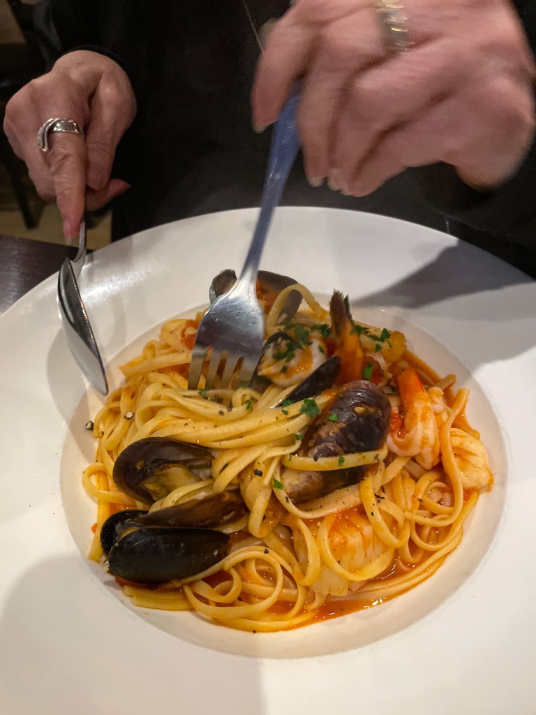 Linguine Adriatica — scallops, prawns, mussels, and garlic tomato sauce.
