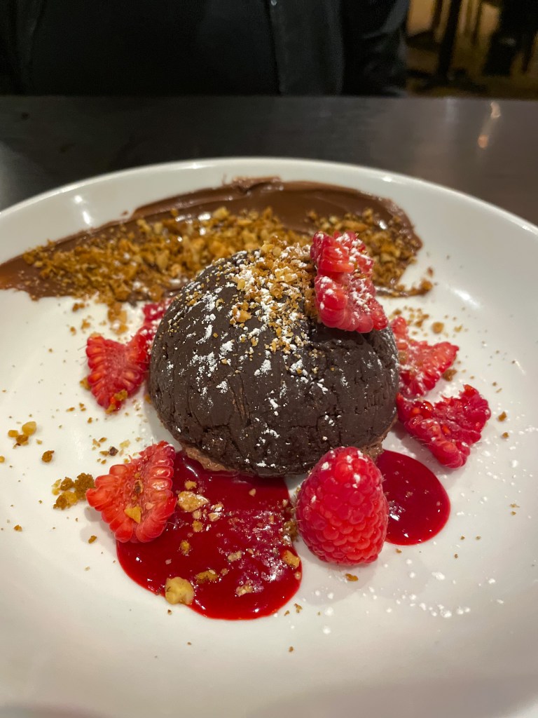 Now, we already knew dessert was happening — no debate there. Zuccotto caught our eye on the specials menu: a chocolate ganache dome cake filled with chocolate hazelnut mousse, topped with raspberry coulis, fresh raspberries, and hazelnut-almond cookie crumble.
