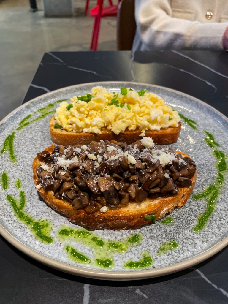 Two slices of sourdough topped with fluffy scrambled eggs, sautéed mushrooms, and fresh chives. It smelled amazing, looked fantastic, and my friend polished it off in no time.